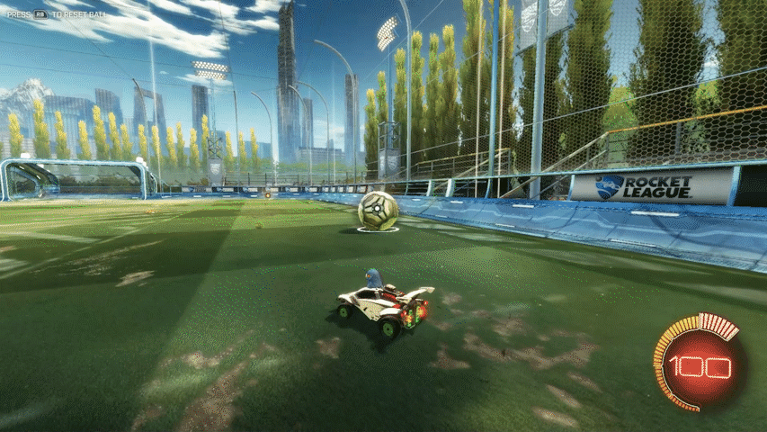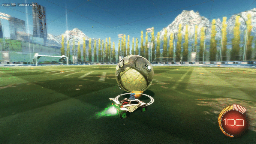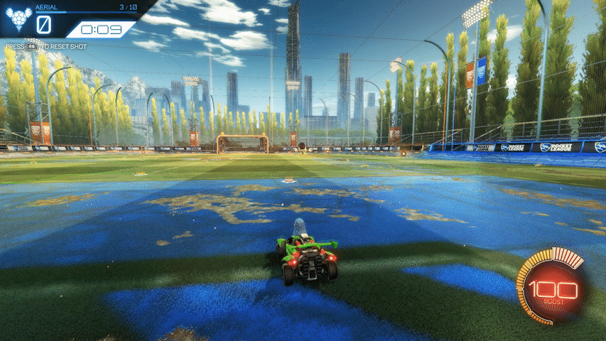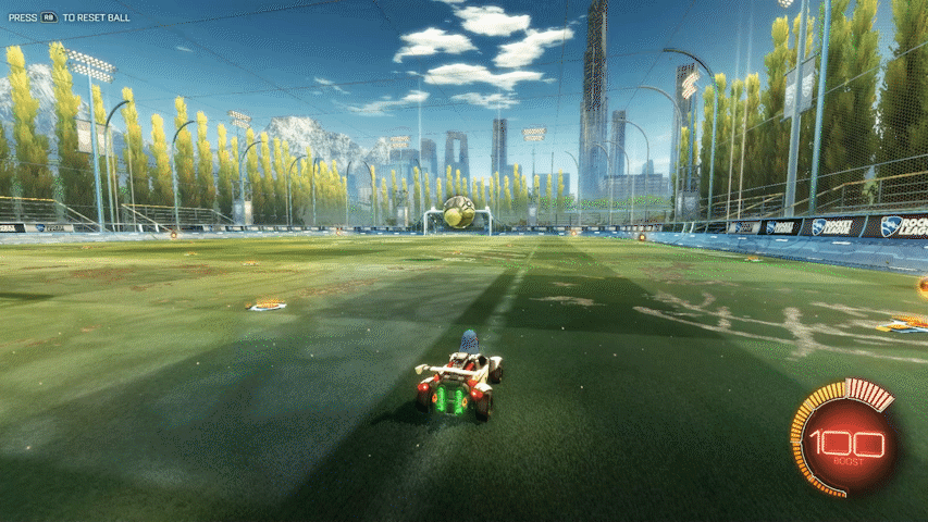 最初にジャンプと同時に車両を上に向け、そのままブーストを使用することで空中を飛ぶことができます。はじめはボールに触ることが非常に難しいですが、トレーニングを繰り返したり実践で失敗を恐れず挑戦するようにすることで次第に触れるようになり、コントロールもよくなっていきます。